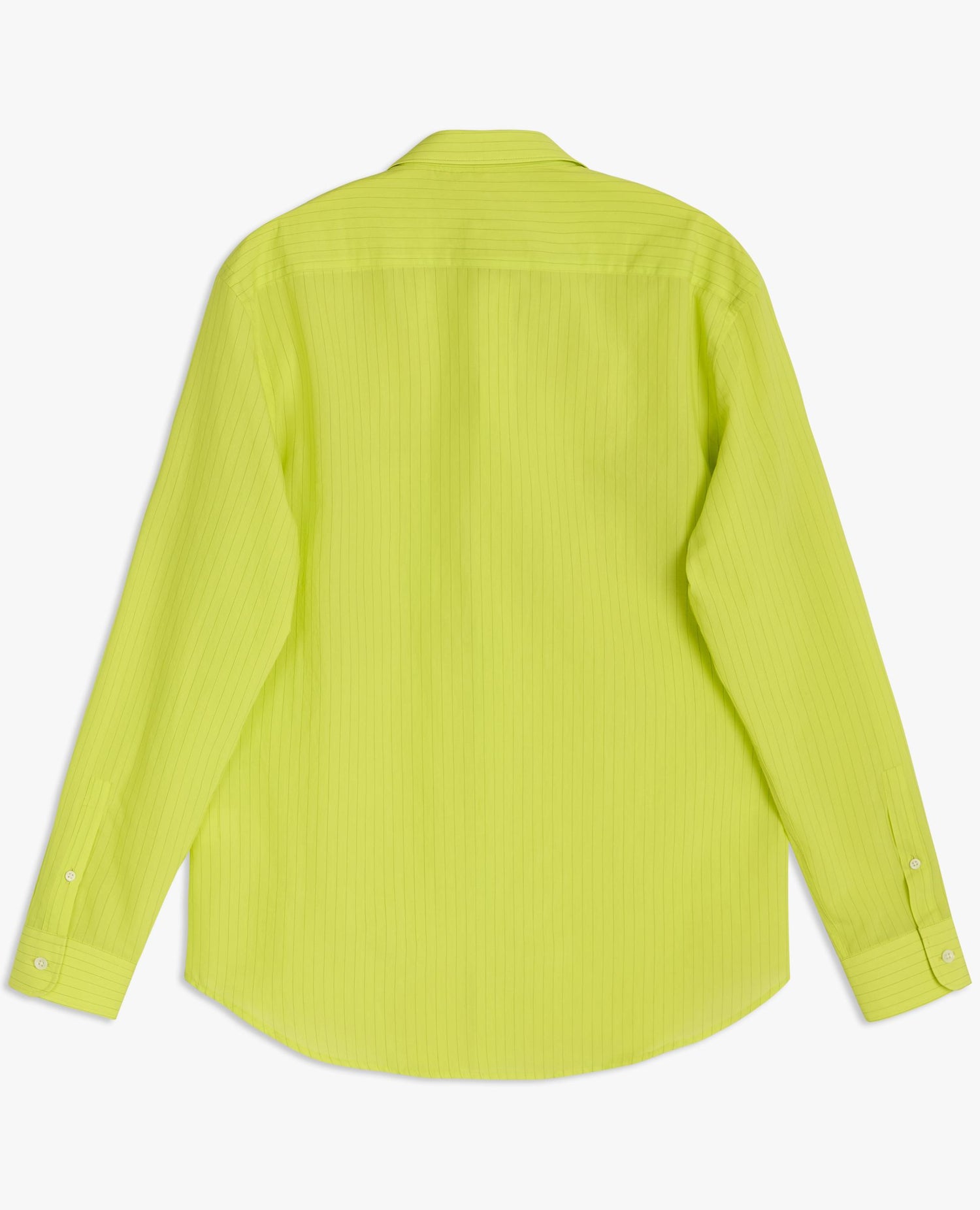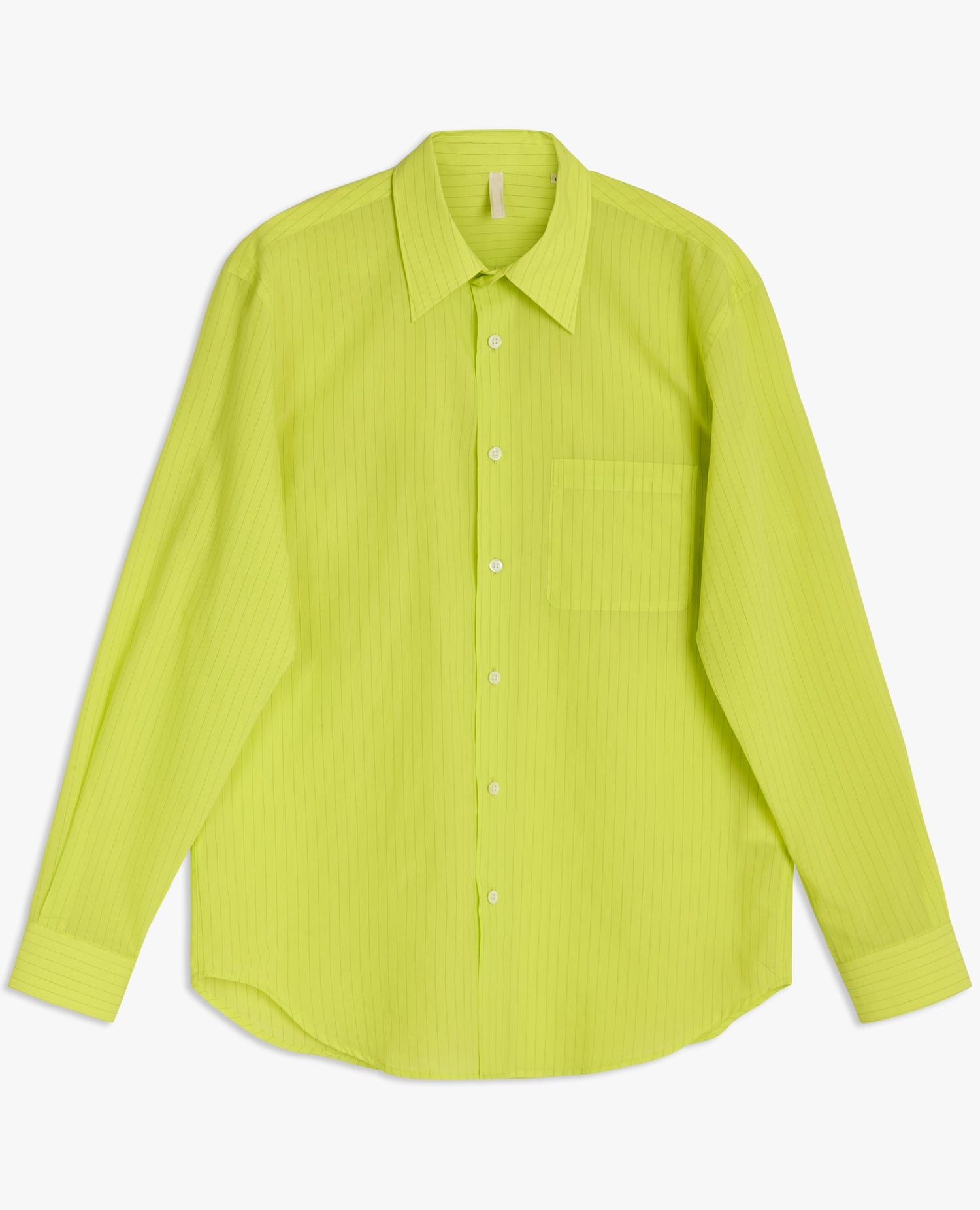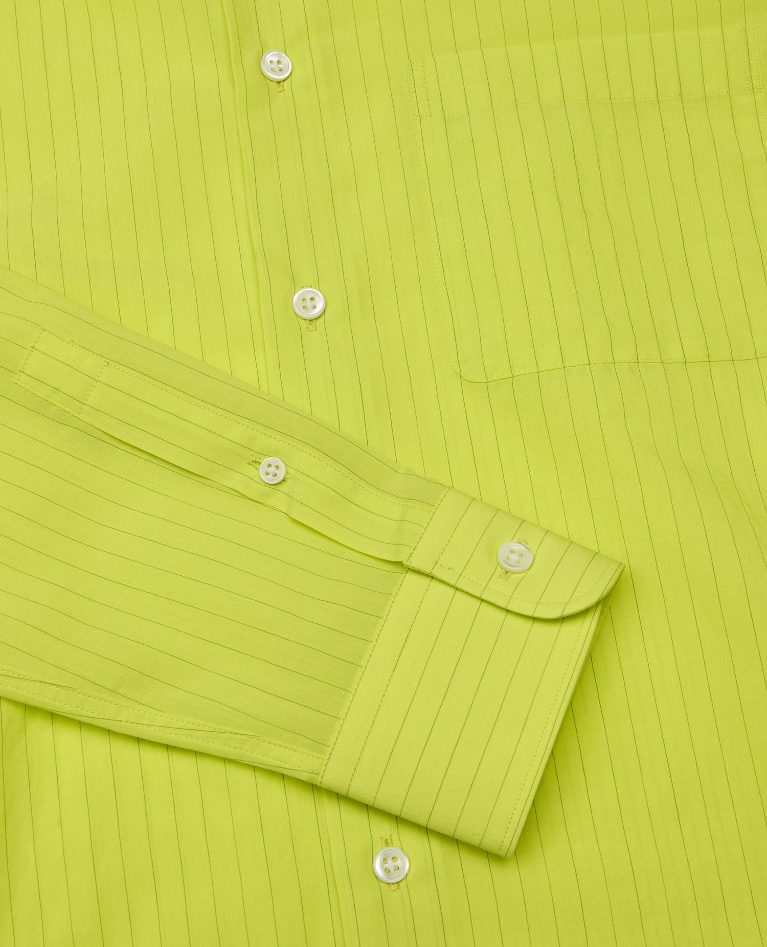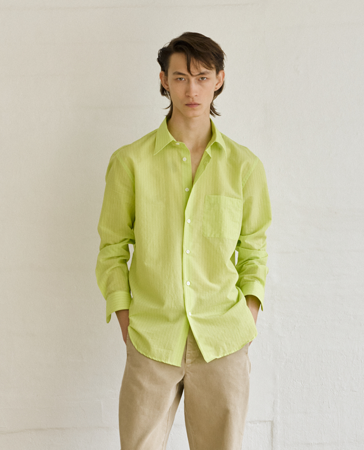 A stunning long-sleeve Oxford shirt featuring a slightly curved hem and a breast pocket. Made of lightweight poplin with a ticking stripe. Closes with a row of genuine mother-of-pearl buttons.