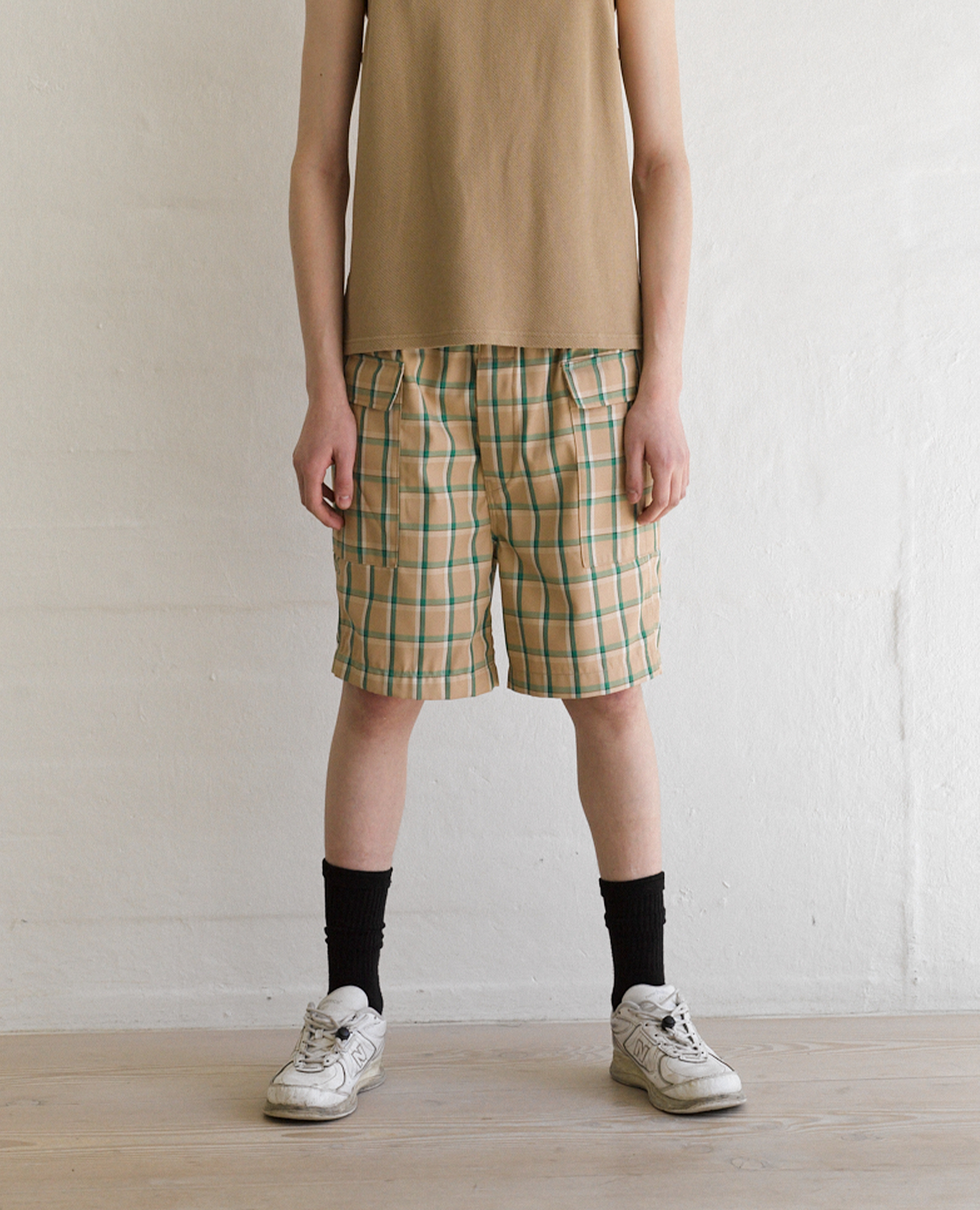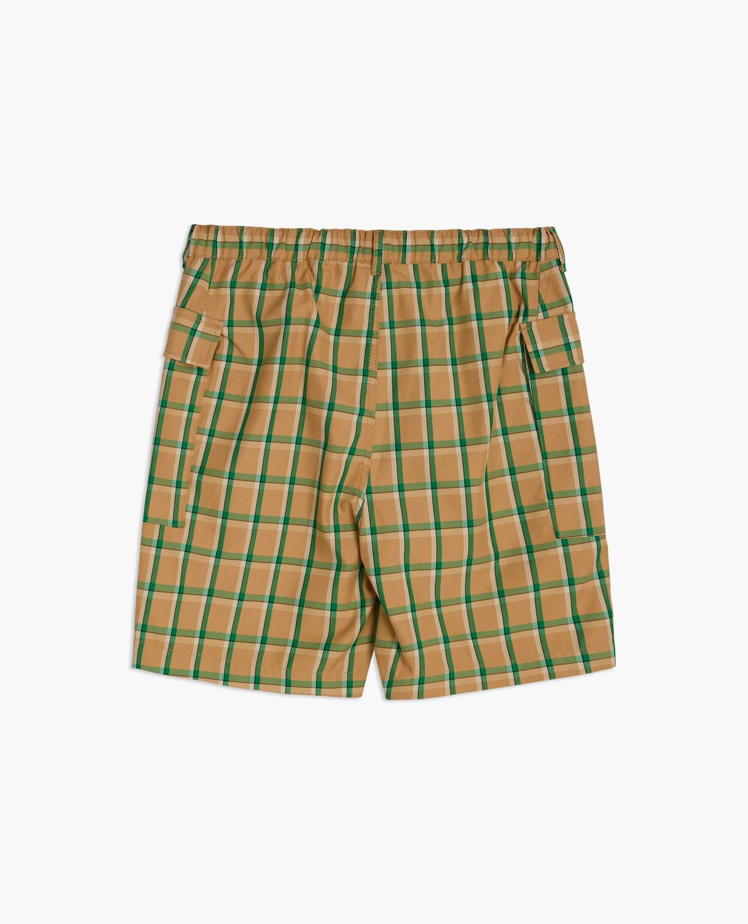 Relaxed-fit cargo shorts in a high-contrast checked pattern with an elastic waistband. Features two spacious front pockets. Button fly and pockets. Made of an Italian recycled polyester and cotton blend.