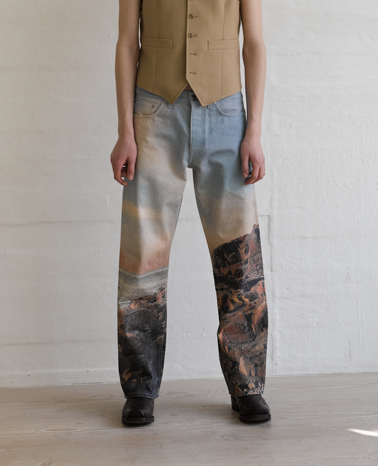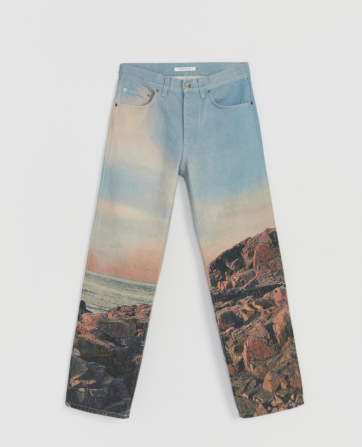 Relaxed-fit Italian-made jeans. Made of 13,5 oz Italian denim spun from GOTS-certified organic cotton. Features five pockets (two back pockets, two front pockets, and a watch pocket) and a button fly. Complete with OEKO-TEX-certified recycled metal trim and a digitally printed photo design.