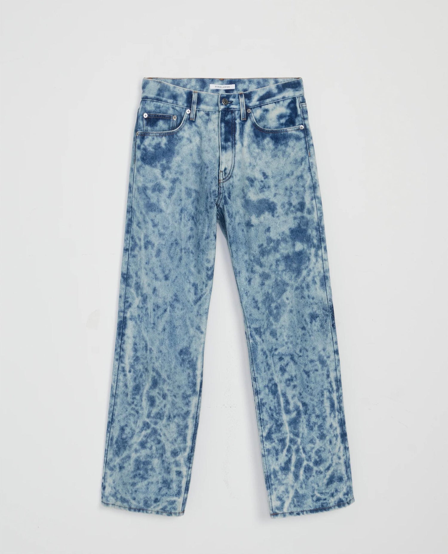 Relaxed-fit Italian-made jeans. Made of 13,5 oz Italian denim spun from GOTS-certified organic cotton. Features five pockets (two back pockets, two front pockets, and a watch pocket) and a button fly. Complete with OEKO-TEX-certified recycled metal trim and a spot-dyed and bleached effect.