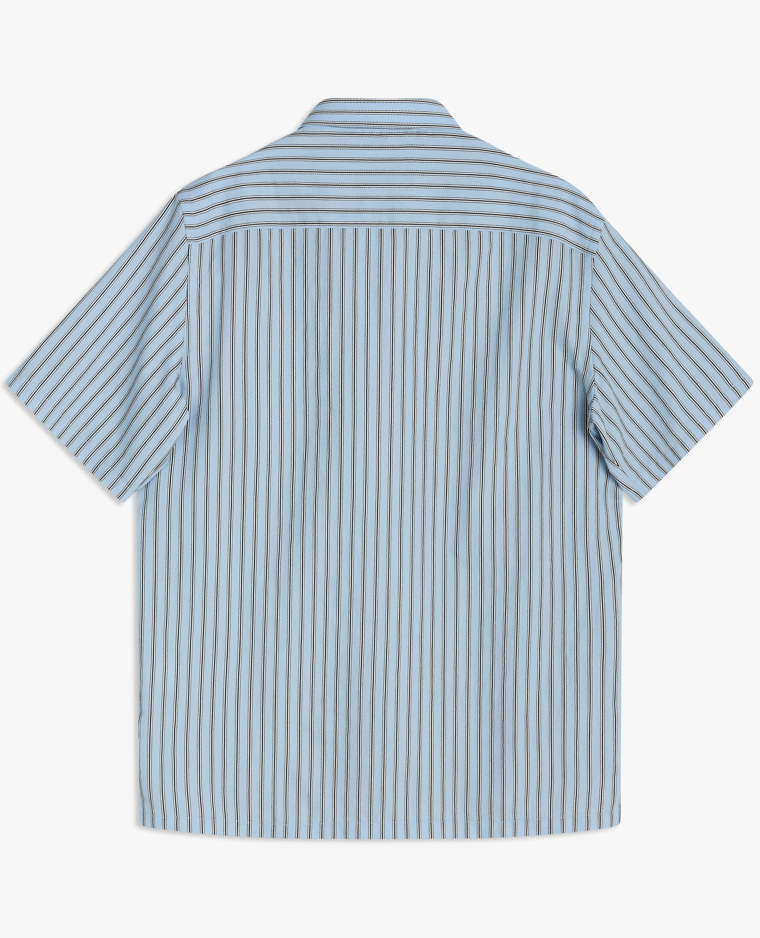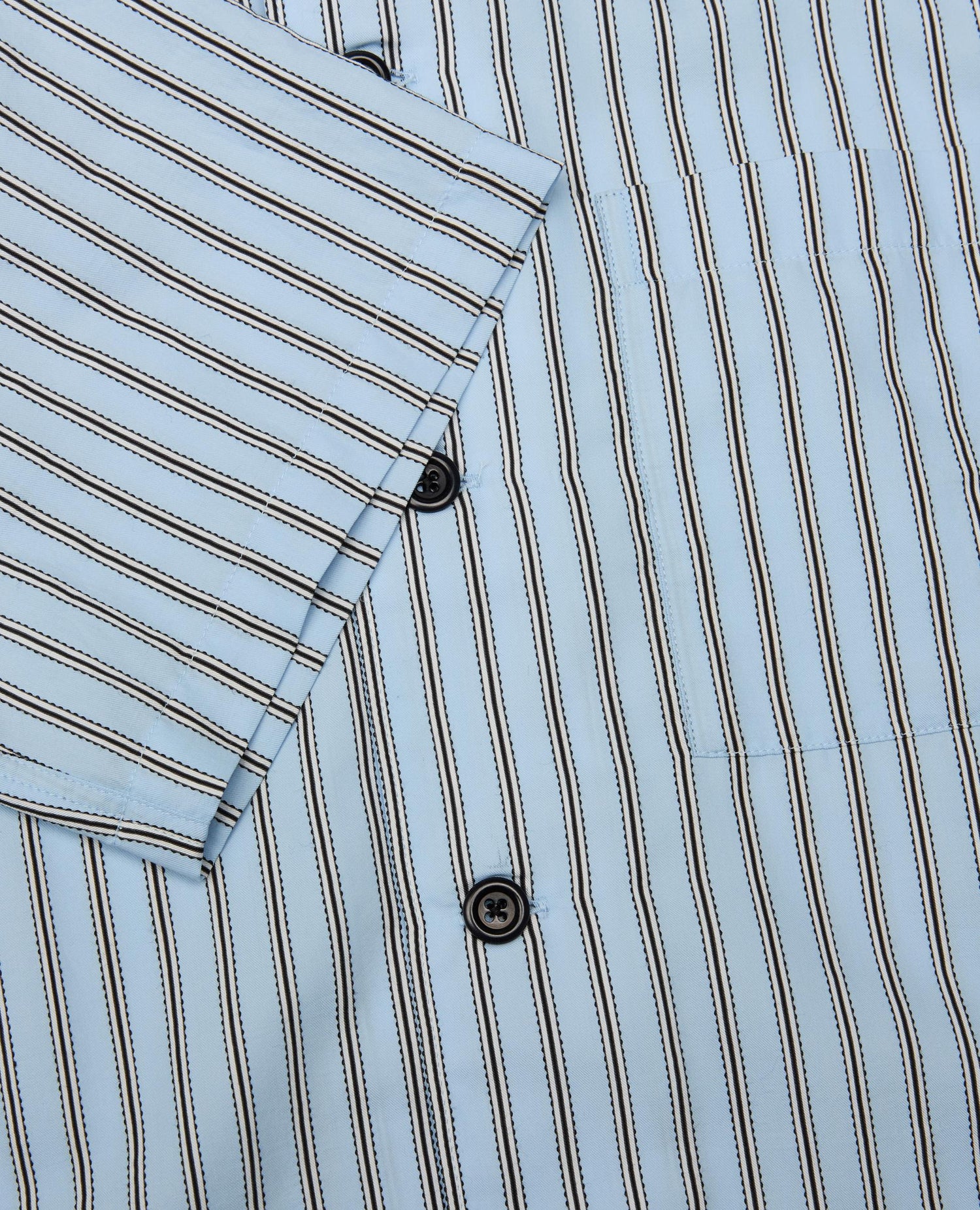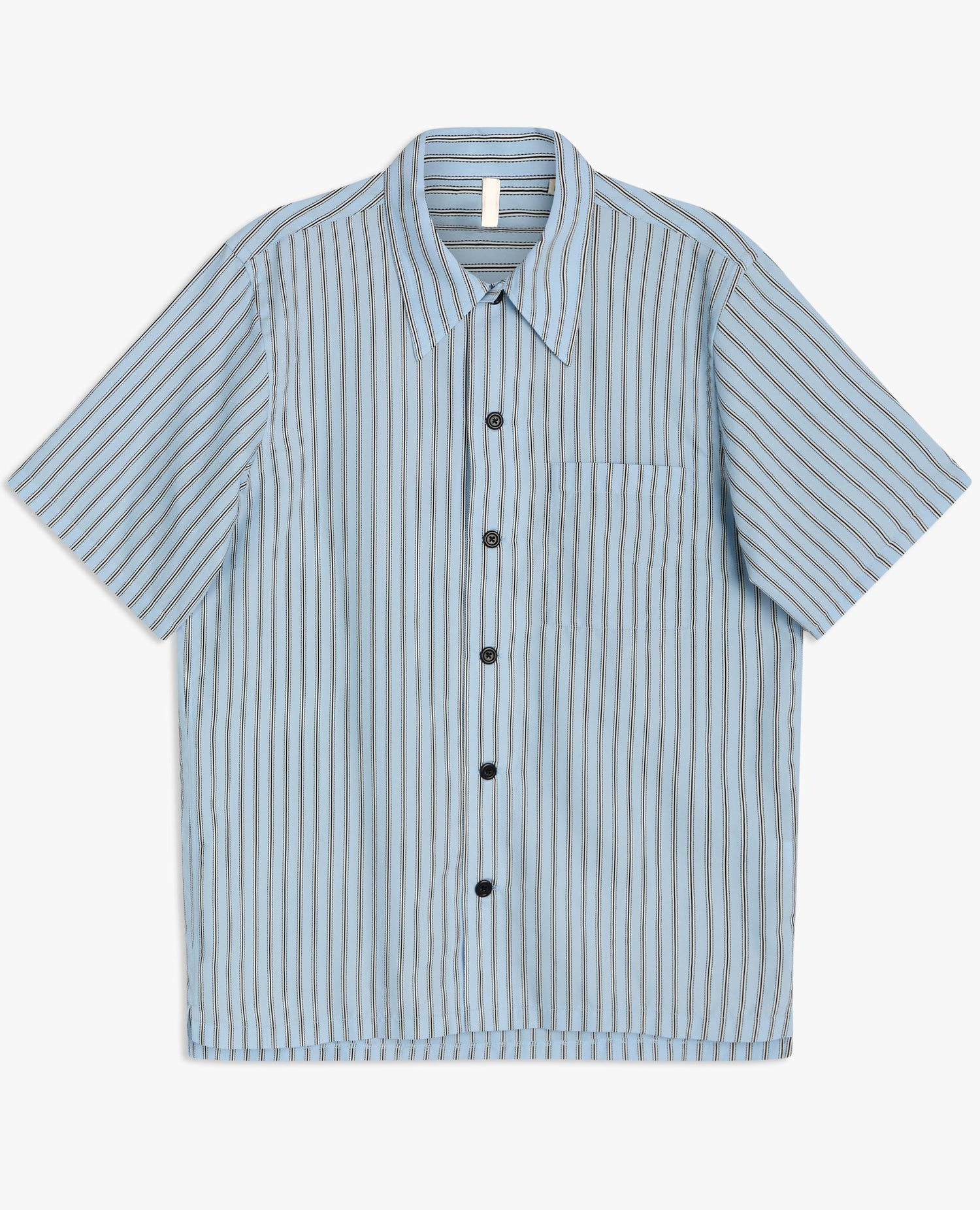 A classic short-sleeved shirt with a straight hem and breast pocket. Made of a lightweight Italian cotton blend featuring yarn-dyed stripes. Closes with a row of genuine mother-of-pearl buttons.