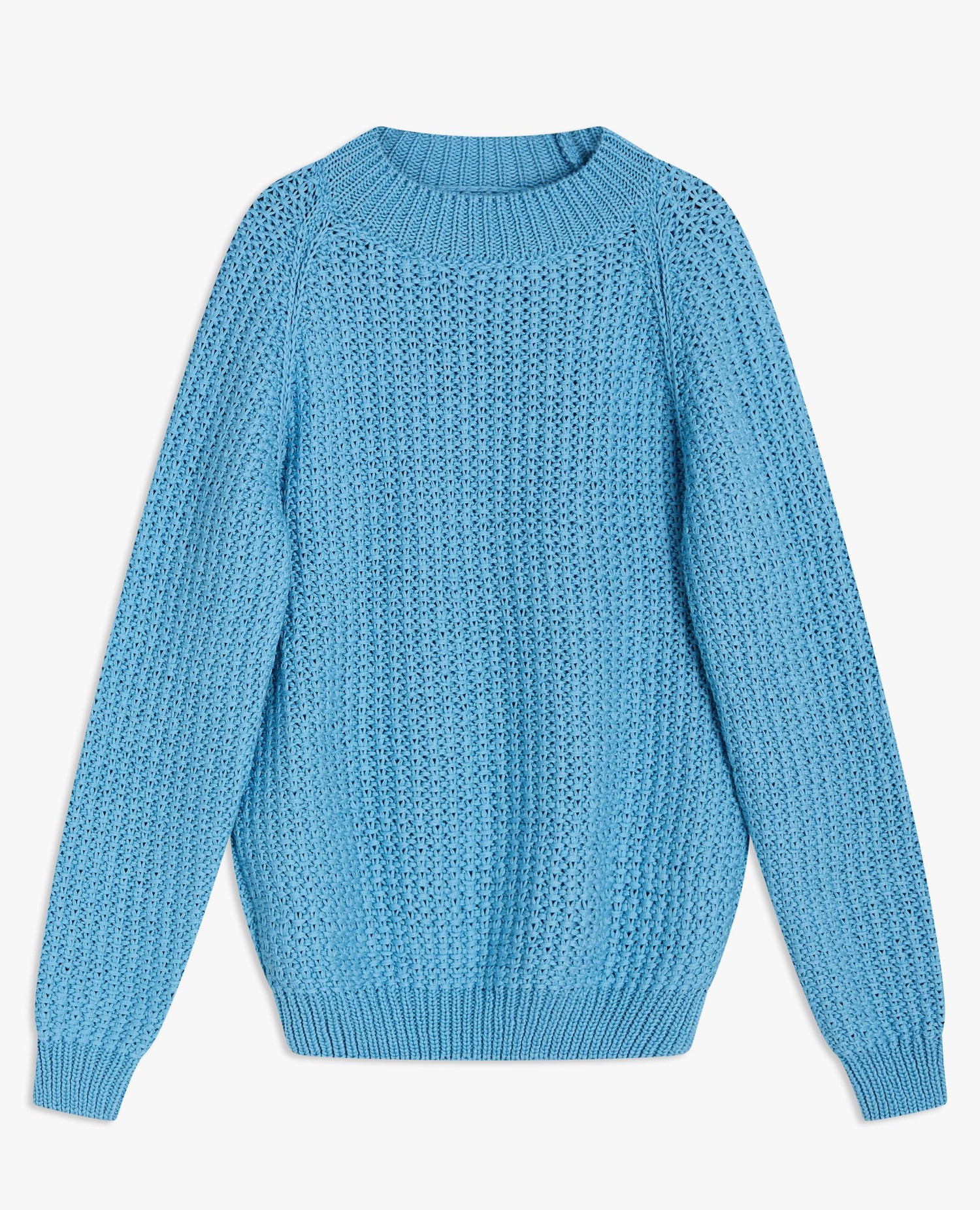 A knitted crew neck jumper in an open garter stitch. Knitted with lightweight cotton blend tape yarn.