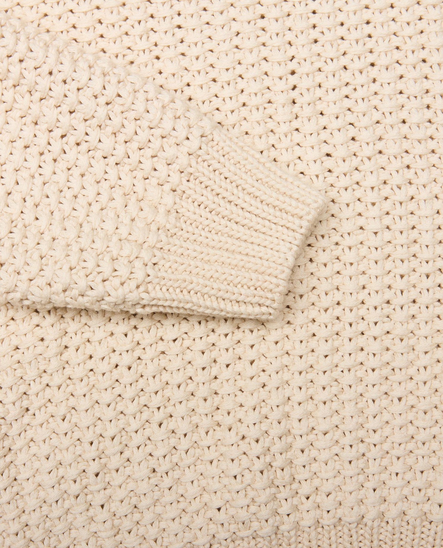 A knitted crew neck jumper in an open garter stitch. Knitted with lightweight cotton blend tape yarn.